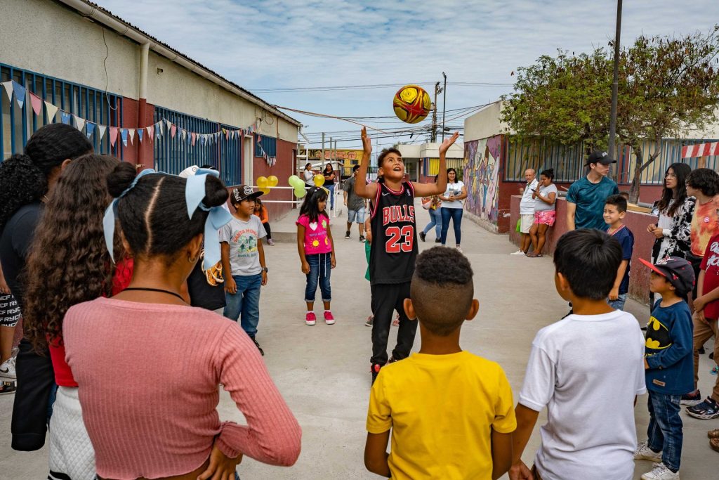 El encuentro ‘tuvo la asistencia de más de 40 niños, niñas y adolescentes de entre 5 y 16 años, tanto chilenos como migrantes, divididos en grupos por rango etario. La primera actividad fue de activación, cuyo fin era que todas y todos -independientes de su edad- se conocieran jugando a la pelota y a los países.