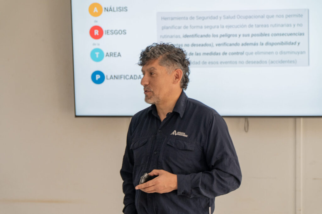 “Queremos que el liderazgo no sólo exista en la supervisión, sino también en los propios trabajadores. Esta campaña busca justamente eso: una excelente confección del ARTP con conciencia y compromiso”, expresó el líder de la Mesa de Seguridad y Salud de Antucoya 2.0, Exequiel Mendoza y parte del equipo a cago del ciclo de talleres para fortalecer el uso del Análisis de Riesgo de la Tarea Planificada (ARTP).